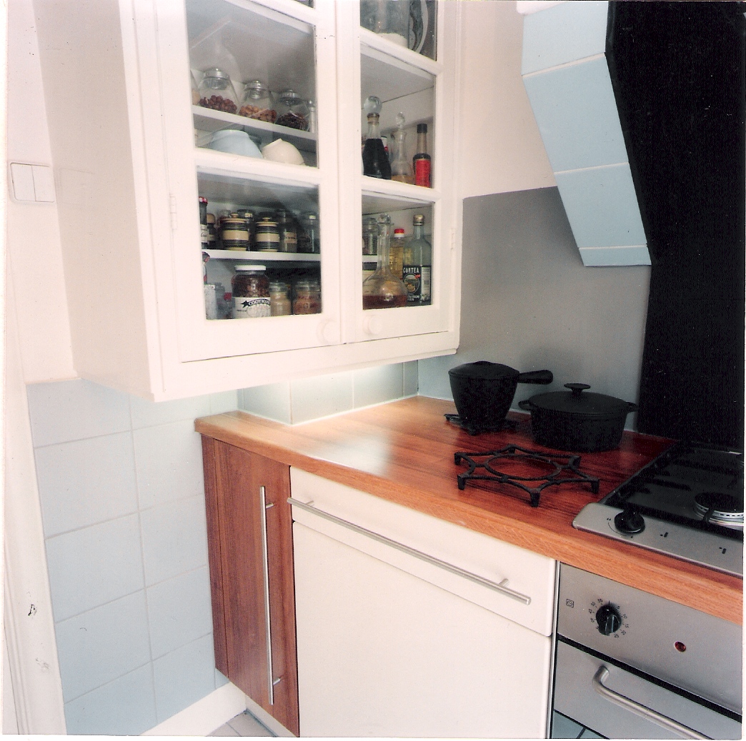 De keuken heeft dezelfde plaats maar is geheel vernieuwd met veel opbergruimte en zonnige design tegeltjes op de achterwand.