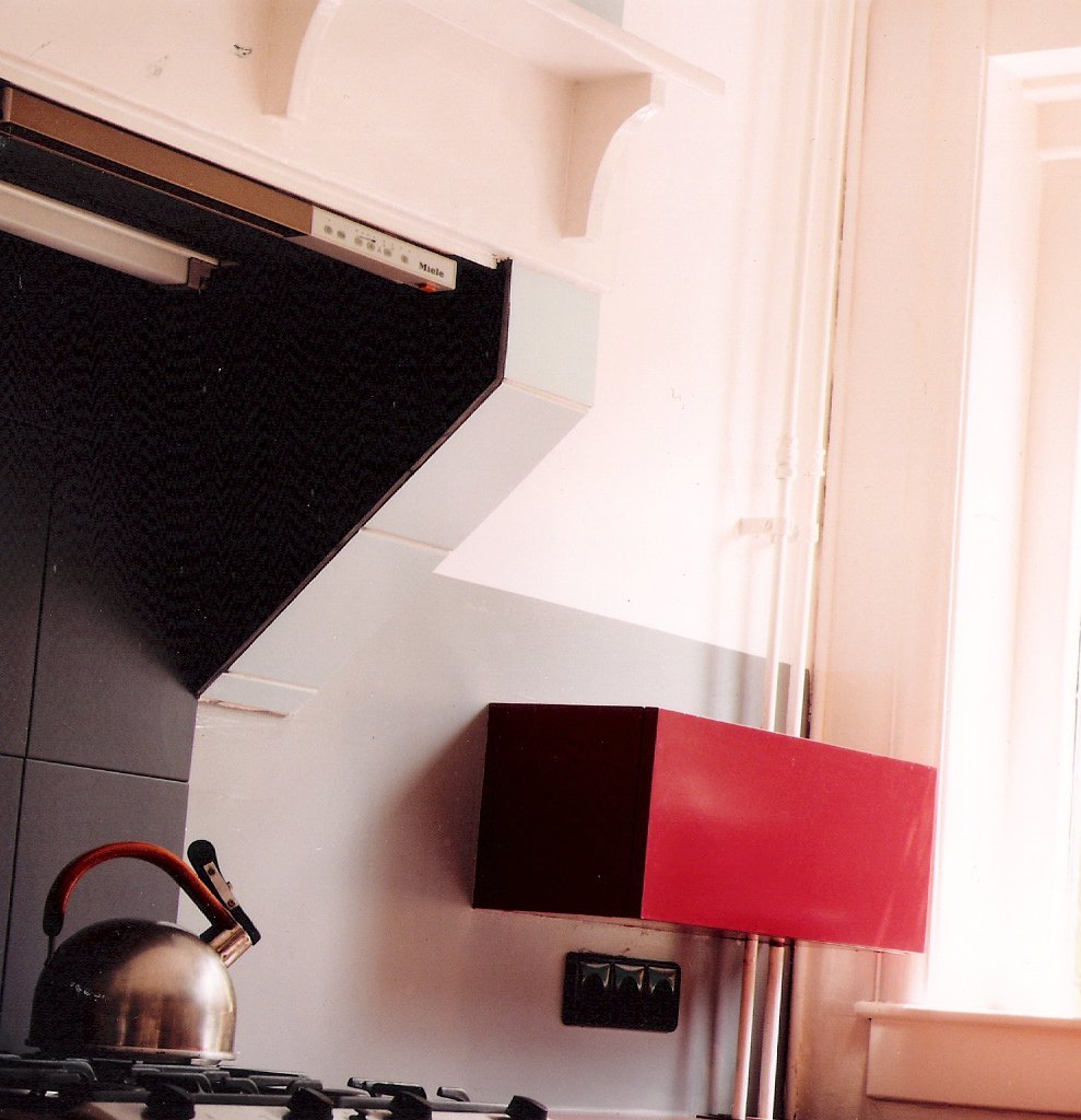 In beide keukens zijn de stijlvolle, klassieke elementen behouden en vervolgens gecombineerd met moderne materialen en kleuren in een strakke, architectonische vlakverdeling. Het op maat ontworpen en gemaakte composiet aanrecht kleur prachtig bij de bestaande tegels. Het rode theekastje in de onderstaande keuken is een opvallend item.